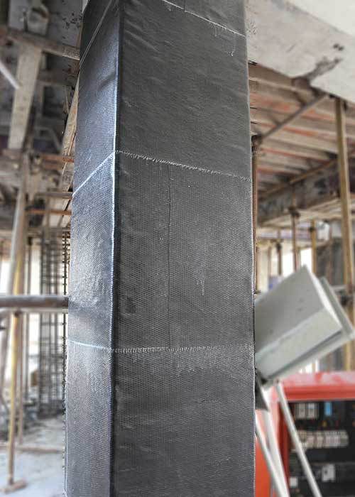 鋼筋混凝土柱(軸向受壓構件)因延性不足而進行抗震加固時,可采用環(huán)向粘貼碳纖維布形成的環(huán)向圍束作為附加箍筋,從而達到提高抗震性能的目的。采用環(huán)向圍束法進行加固時,對所加固構件有明顯的約束作用,在軸向壓力的作用下,混凝土構件處于三向受壓狀態(tài),可以較大幅度的提高混凝土受壓承載力,增強結構延性,可明顯提高結構的抗震性能。