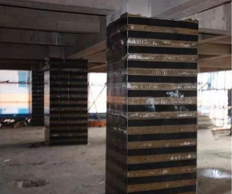 當框架柱斜截面受剪承載力不足時,可將碳纖維布粘貼成環(huán)形箍,且纖維方向應與柱的縱軸心垂直。