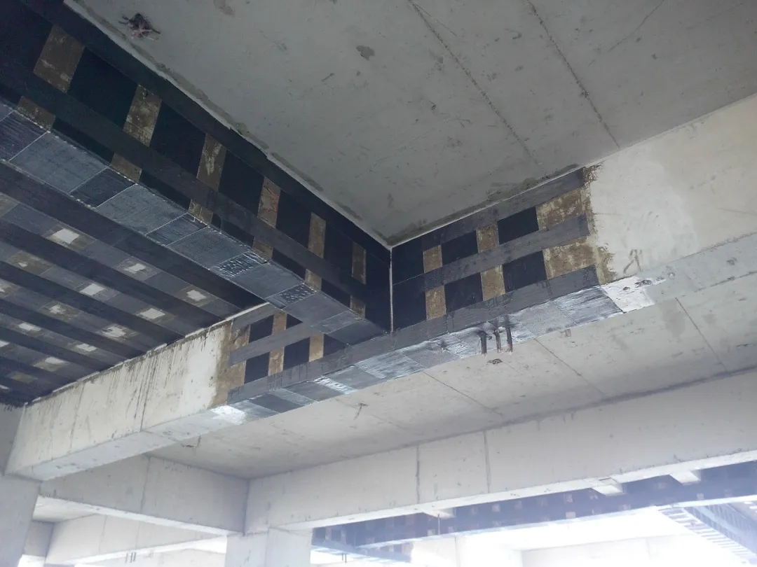 當混凝土構件出現(xiàn)裂縫且需要對裂縫進行修復時,可先使用灌縫膠對裂縫進行修復后,再進行碳纖維布粘貼。粘合碳纖維布可以限制裂縫的發(fā)展,間接提高結構的抗裂性。