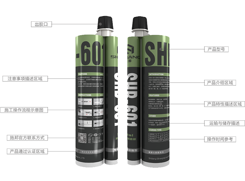 SHB-601注射式植筋膠(專業(yè)工程加強(qiáng)型)系A(chǔ)、B組分高強(qiáng)復(fù)合型環(huán)氧樹脂膠粘劑,使用專用的注射槍注射,兩組分在可更換的靜態(tài)混合器中充分混合直接注入鉆孔內(nèi)